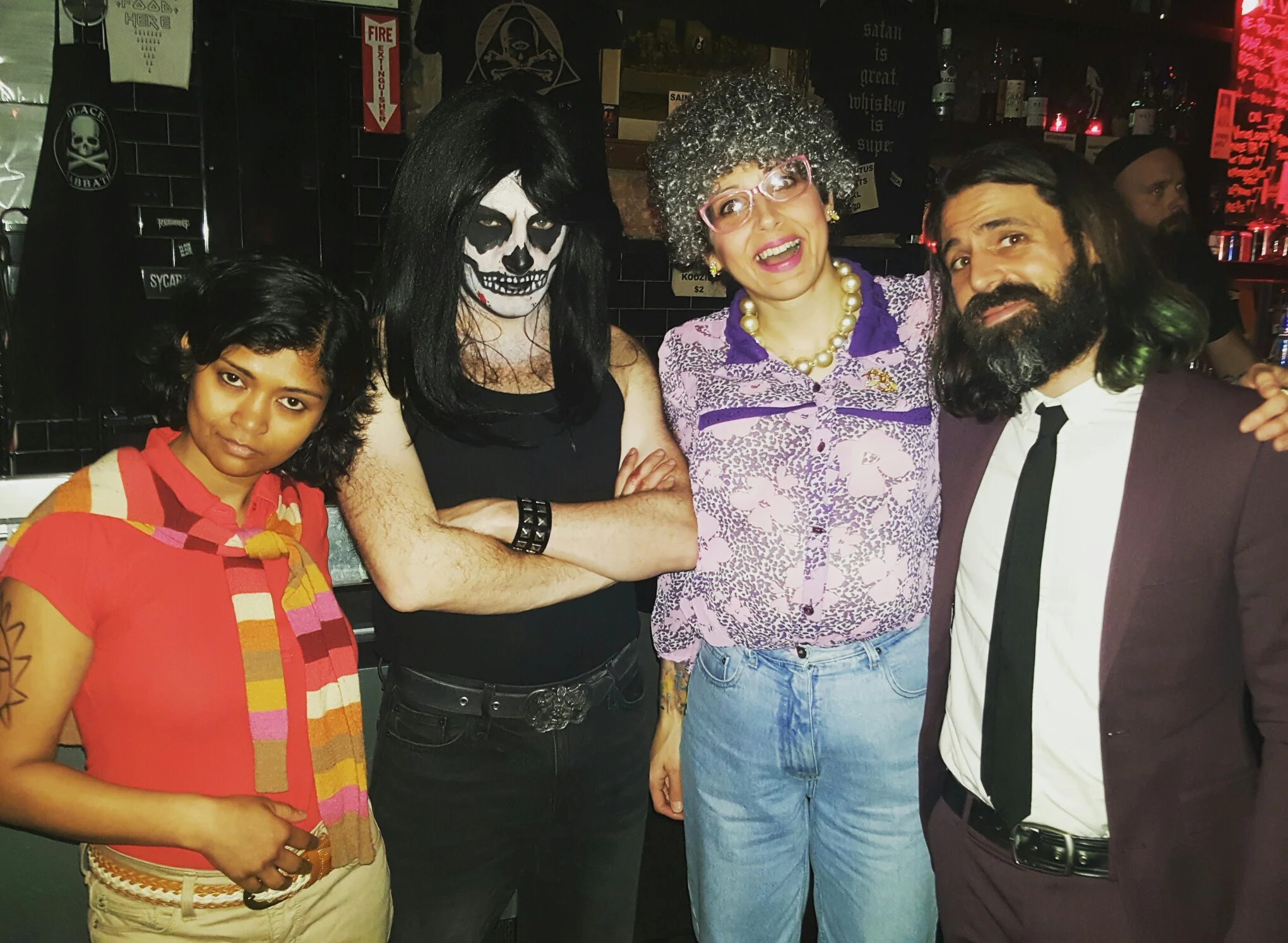 I also had the privilege of performing/competing alongside my pal Nithya, who I used to work with at The Kings of Karaoke. In fact, there were other TKOK folks who took part: the host Tom aka Smo (who lent me that awesome belt) and Cassie who was one of the judges (Comic Alison Leiby and Mutoid Man/Cave In Guitarist Stephen Brodzky rounded out the trio). Here's all four of us karaokers in Air Guitarb (c what i did there?).